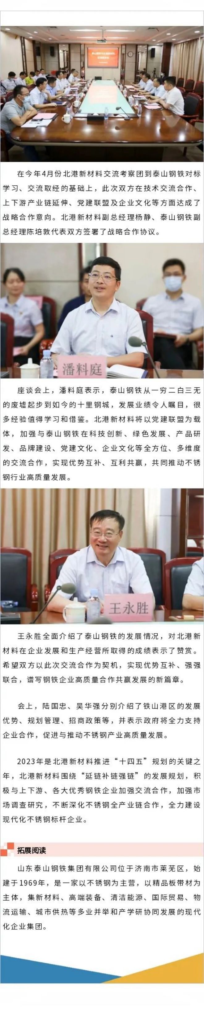 5月24日,北港新材料與山東泰山鋼鐵集團在北港永不銹書院成功簽訂戰略合作協議。此次與泰山鋼鐵的戰略合作,將為北港新材料提質增效、加快轉型升級注入新的力量。