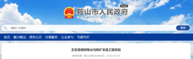6月4日,鞍山市人民政府網站發布了《王忠昆調研陳臺溝鐵礦采選工程項目》一文。