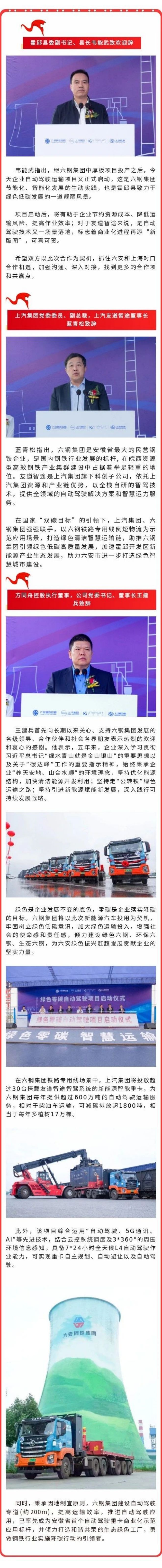 霍邱縣委副書記、縣長韋能武,霍邱經濟開發區(現代產業園)管委會主任王祥磊應邀出席儀式。上汽集團黨委委員、副總裁,上汽友道智途董事長藍青松,上汽集團商用車事業部副總經理趙茂青,上汽集團商用車事業部副總經理桂龍明,上汽紅巖汽車有限公司總經理楊漢琳,上汽友道智途CEO王瑞等合作伙伴受邀參加。方同舟控股執行董事,公司黨委書記、董事長王建兵,總裁牛樹林,黨委副書記、行政總裁光超等公司高管及各部門代表參加。儀式由霍邱縣副縣長毛玲霞主持。