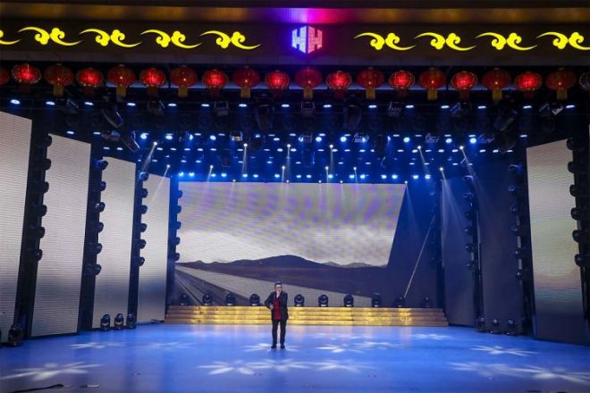 在《沒有共產黨就沒有新中國》的旋律中,全場起立,共同歌唱,呈現出一片紅色的海洋,表達著宏興兒女對黨的無限崇敬與頌揚。