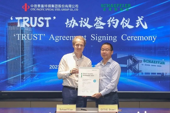 6月27日,中信泰富特鋼集團與舍弗勒集團簽訂TRUST協(xié)議。中信泰富特鋼成為舍弗勒全球范圍內(nèi)第一家授牌的TRUST鋼廠,這既是舍弗勒對中信泰富特鋼在材料供應(yīng)、技術(shù)創(chuàng)新、難題攻克、雙碳減排實施等方面實績的肯定,也是推進舍弗勒和中信泰富特鋼未來發(fā)展的新起點。未來,雙方將進一步深化和拓展長期戰(zhàn)略合作關(guān)系,繼續(xù)在綠色可持續(xù)發(fā)展供應(yīng)鏈、新產(chǎn)品與技術(shù)、數(shù)字化互聯(lián)等領(lǐng)域開展深入合作。