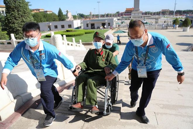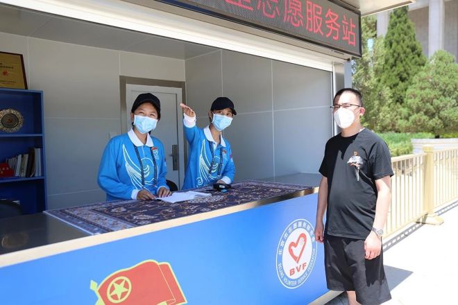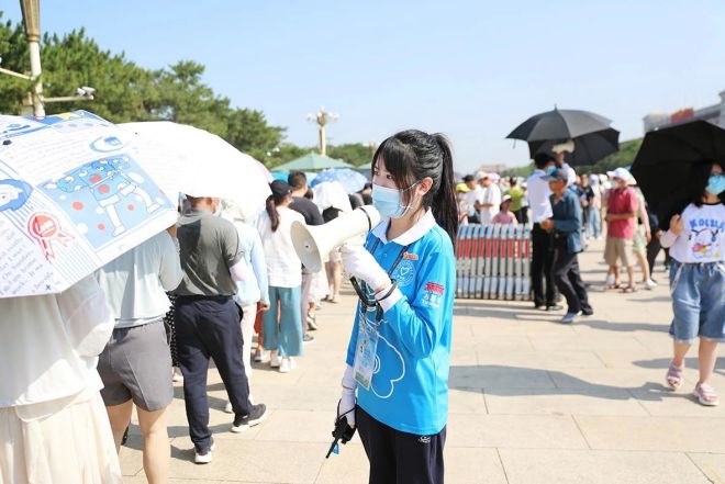端午假期的北京持續高溫,中午天安門廣場地區的溫度達到了41度以上,體感溫度更是達到47度以上,6月23日11點58分,在紀念堂東門外有一名瞻仰群眾出現中暑癥狀,癱倒在地。首鋼在崗志愿者王寧和李涵宇第一時間對其進行了救助,李涵宇迅速把中暑者攙扶到武警的遮陽傘下,王寧立即給中暑者貼了冰涼貼,并用礦泉水不斷地擦拭中暑者頭部和脖頸,用清涼油擦拭中暑者太陽穴。過程中還不斷安慰中暑者,慢慢地中暑者恢復了意識,志愿者們把中暑者交給管轄警察后才放心離開。6月25日,志愿者程昊剛剛上崗,看到一位坐著輪椅的90歲老人,想進入紀念堂瞻仰毛主席,見老人行動不方便,程昊就和北助殘崗的志愿者一起把老人的輪椅拉上了紀念堂高臺,為了輪椅不打滑,程昊還主動摘掉了手套。做這樣的小事,就是志愿者每天的日常。