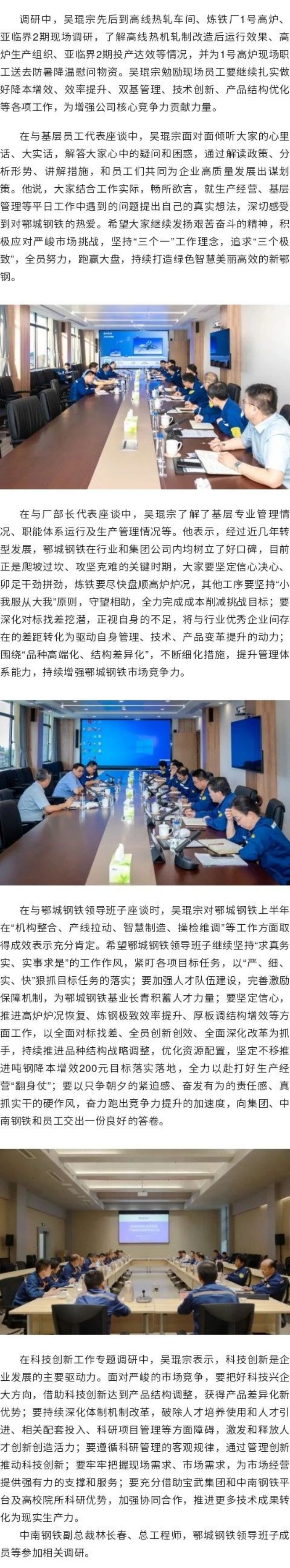 6月27日至28日,中南鋼鐵總裁、黨委副書記吳琨宗赴鄂城鋼鐵開展主題教育專題調研,聚焦企業(yè)生產(chǎn)經(jīng)營、員工需求、專業(yè)管理和職能體系運行、科技創(chuàng)新等方面深入調查研究,分別與基層員工代表、廠部長代表、鄂城鋼鐵領導班子、技術研發(fā)人員代表等座談交流。吳琨宗強調,面對鋼材市場嚴峻形勢,要以主題教育強根鑄魂,全心全意依靠全體干部職工,激發(fā)全員奮進動力,扎實有效推進各項工作落實落地,努力推動鄂城鋼鐵在“冬練”中逆勢而上、爭做標桿,以主題教育實效推動企業(yè)高質量發(fā)展。