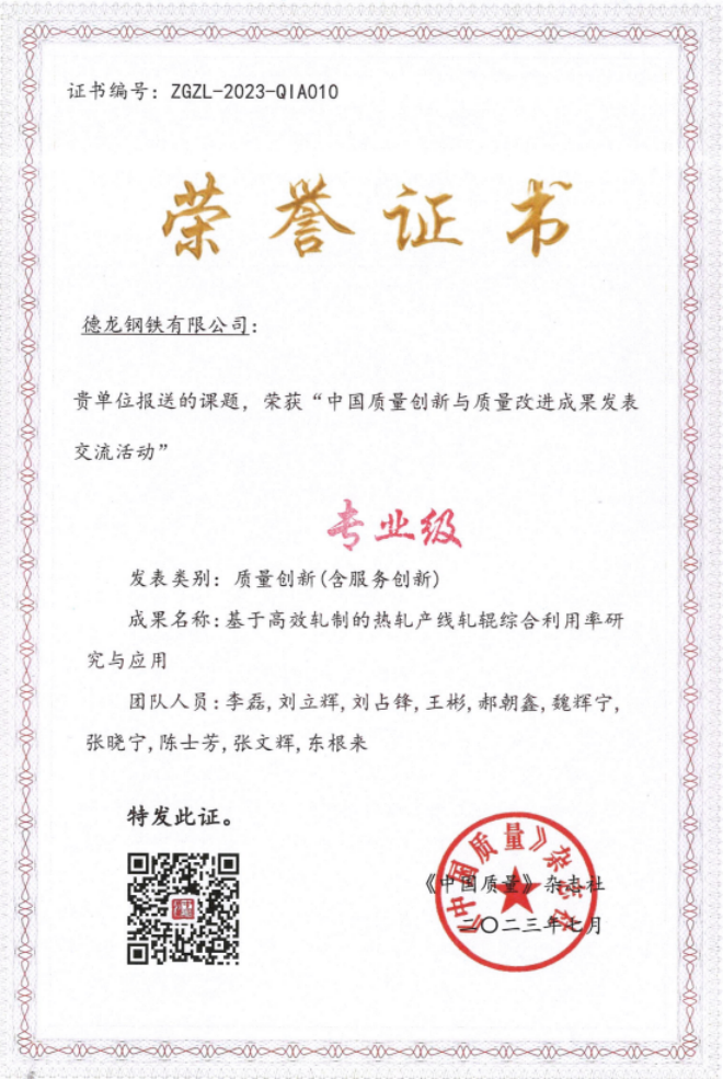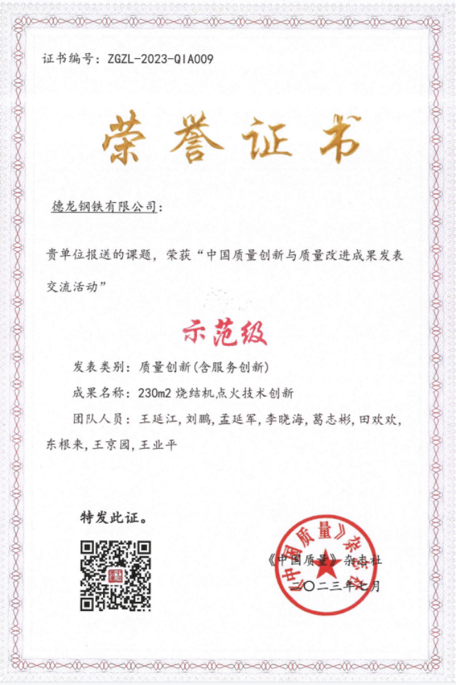 近日,在中國質(zhì)量協(xié)會主辦的“中國質(zhì)量創(chuàng)新與質(zhì)量改進(jìn)成果發(fā)表交流活動”中,德龍鋼鐵《230m2燒結(jié)機(jī)點(diǎn)火技術(shù)創(chuàng)新》與《基于高效軋制的熱軋產(chǎn)線軋輥綜合利用率研究與應(yīng)用》兩大技術(shù)創(chuàng)新項(xiàng)目,憑借在質(zhì)量創(chuàng)新方面的新穎性、實(shí)用性及有效性等,獲得評審專家的一致好評,經(jīng)材料評選和現(xiàn)場發(fā)表,分別被評為“國家示范級質(zhì)量創(chuàng)新成果”與“國家專業(yè)級質(zhì)量創(chuàng)新成果”,充分展現(xiàn)了公司在工藝改進(jìn)、技術(shù)突破、管理提升等方面不斷突破、持續(xù)進(jìn)取的創(chuàng)新精神。
