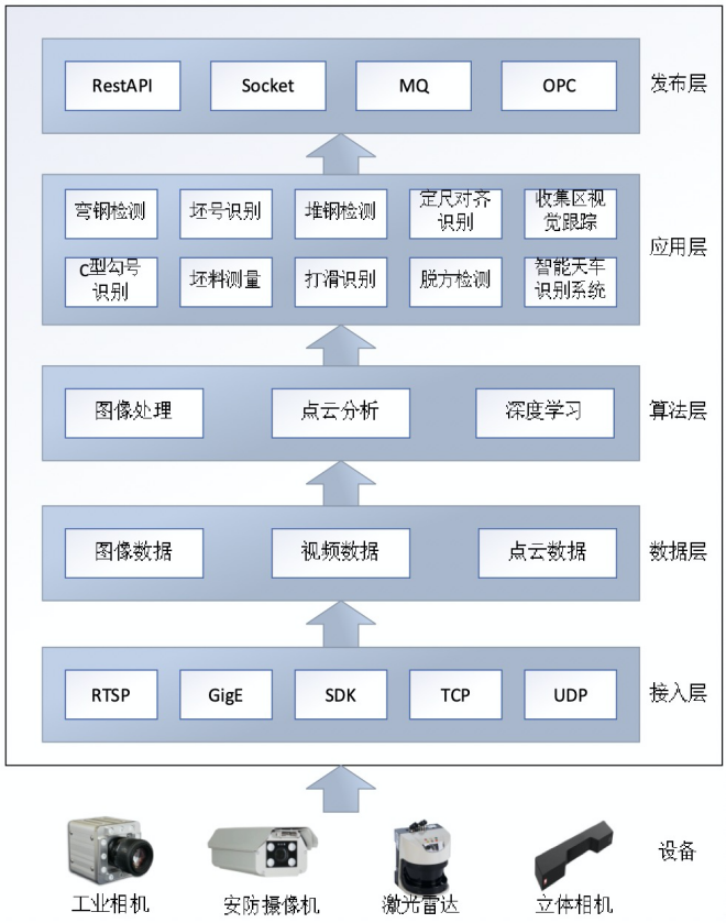 中冶京誠機(jī)器視覺智慧感知平臺基于邊緣端技術(shù)構(gòu)建機(jī)器視覺智慧應(yīng)用,在現(xiàn)場應(yīng)用端打造“硬件+軟件+算法”的一體化成套邊緣端機(jī)器視覺產(chǎn)品,實(shí)現(xiàn)硬件標(biāo)準(zhǔn)化、軟件模塊化和算法定制化。其中,硬件包括圖像采集設(shè)備(工業(yè)相機(jī)、安防攝像機(jī)、激光雷達(dá)、立體相機(jī)等)和存儲、計算、網(wǎng)絡(luò)等基礎(chǔ)資源,軟件包括異構(gòu)設(shè)備接入、多源數(shù)據(jù)(圖像、視頻、點(diǎn)云等)預(yù)處理、分析結(jié)果發(fā)布、識別控制指令下發(fā)、數(shù)據(jù)本地化等核心支持功能,算法指包括圖像處理算法、深度學(xué)習(xí)算法、點(diǎn)云分析算法等用于在特定業(yè)務(wù)場景下進(jìn)行視覺識別的核心計算功能。平臺采用模塊化設(shè)計理念進(jìn)行內(nèi)核開發(fā),支持進(jìn)行應(yīng)用層的二次開發(fā),定制化實(shí)現(xiàn)機(jī)器視覺在特定場景下的應(yīng)用。