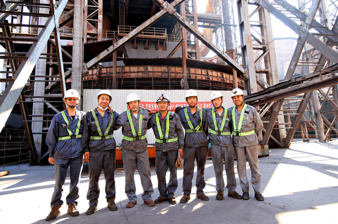 煉鐵廠最后一爐鐵水的當班爐前工在爐臺合影。