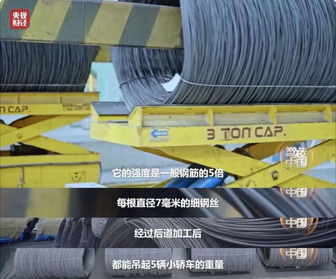 智能化高標(biāo)準(zhǔn)生產(chǎn)的全球強(qiáng)度最高的纜索鋼絲用鋼盤條的強(qiáng)度能達(dá)到一般鋼筋的5倍。每根直徑7毫米的細(xì)鋼絲經(jīng)過后道加工后,都能吊起5輛小轎車的重量。