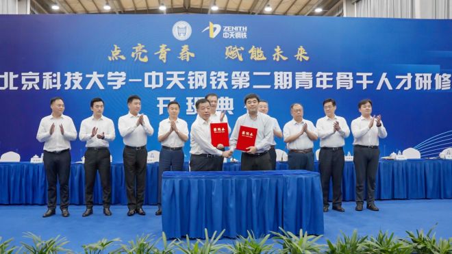 開班儀式上,北科大—中天鋼鐵協同創新中心第一期項目簽約,該中心于今年5月成立,由中國工程院院士、北科大碳中和創新研究院院長毛新平擔任主任,目前已形成第一批五項科研項目。北京科技大學實踐教學基地也于當天揭牌,中天鋼鐵將發揮產業優勢,為北科大學子提供學習實踐機會,幫助學生了解企業運作,實現產教融合、共同育才。