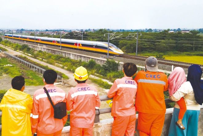 在印尼萬隆,雅萬高鐵建設者和當地民眾觀看雅萬高鐵運行。