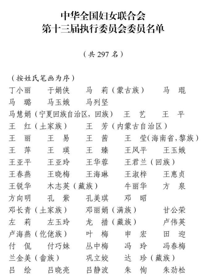 大會首先通過了總監票人、監票人名單(草案),隨后以無記名投票方式選舉產生了中華全國婦女聯合會第十三屆執行委員會委員。297人當選中華全國婦女聯合會第十三屆執行委員會委員。