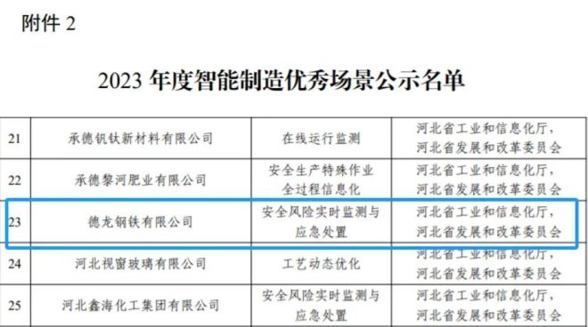 近日,國家工業(yè)和信息化部公示了2023年度智能制造示范工廠揭榜單位和優(yōu)秀場景名單,通過企業(yè)申報、市工信局審核推薦、省工信廳、國家工信部評審等環(huán)節(jié)的層層遴選,邢臺德龍申報的“安全風(fēng)險實時監(jiān)測與應(yīng)急處置”案例成功入選國家智能制造優(yōu)秀場景。