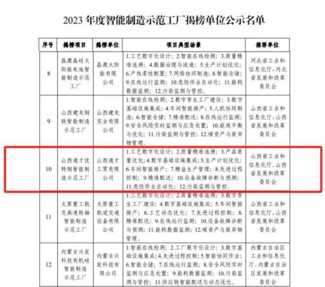 近日,國家工業(yè)和信息化部發(fā)布《關(guān)于2023年度智能制造示范工廠揭榜單位和優(yōu)秀場景名單的公示》,山西通才工貿(mào)有限公司及山西建邦鑄造有限公司均榜上有名。