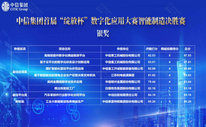 來自中信重工、中信戴卡、中信控股、中信泰富特鋼、中信錦州金屬、利電能源、白銀有色的16個(gè)參賽項(xiàng)目經(jīng)過專家書面評審,殺進(jìn)決勝賽,角逐“最佳應(yīng)用獎(jiǎng)”“最佳平臺獎(jiǎng)”“新銳獎(jiǎng)”三大獎(jiǎng)項(xiàng)。中信泰富特鋼共有6個(gè)項(xiàng)目入圍決勝賽。