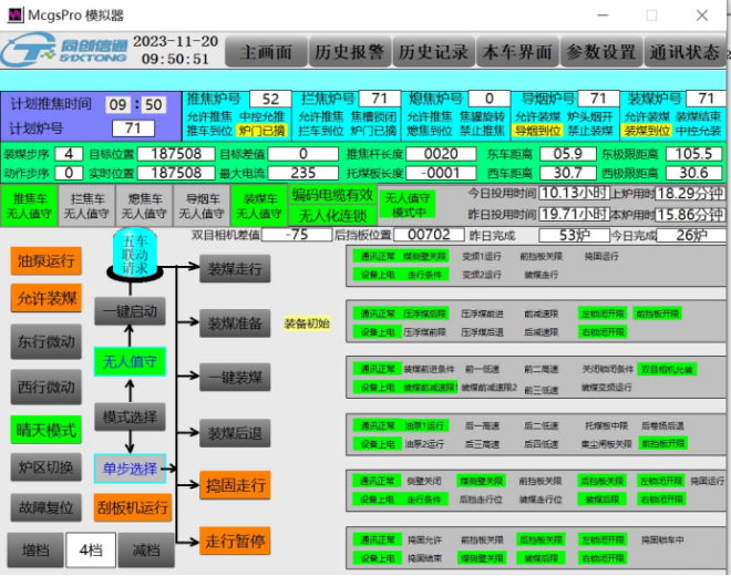 為解決作業(yè)效率、穩(wěn)定率存在差異這一問題,開發(fā)了工況及環(huán)境變化自適應(yīng)的高精度機(jī)車定位控制系統(tǒng),不僅可克服極寒和大溫差天氣對機(jī)車定位精度造成的負(fù)面影響,還實現(xiàn)了對機(jī)車及爐體工況的自動適應(yīng),即時調(diào)整機(jī)車運動參數(shù)。經(jīng)在建龍西鋼投入使用,目前定位控制精度偏差為±2毫米,一次對準(zhǔn)率為99%,二次對準(zhǔn)率可達(dá)100%,真正實現(xiàn)了焦?fàn)t機(jī)車標(biāo)準(zhǔn)化作業(yè),提升了生產(chǎn)效率。