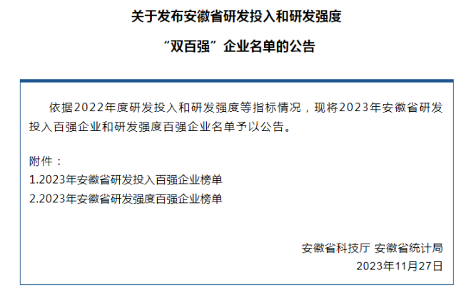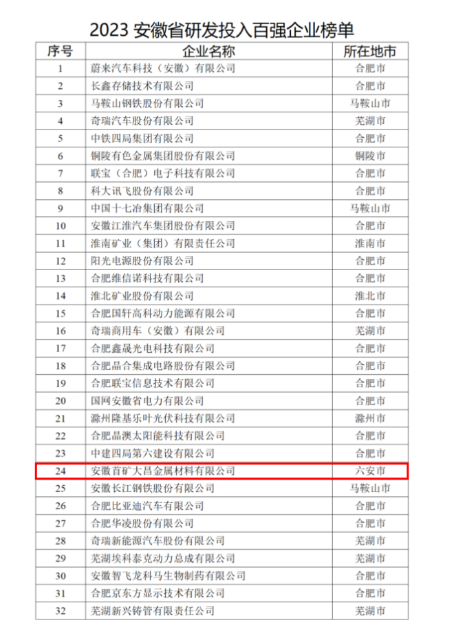 近日,安徽省科技廳、安徽省統計局發布《關于發布安徽省研發投入和研發強度“雙百強”企業名單的公告》?!豆妗分赋?,依據2022年度研發投入和研發強度等指標情況,現將2023年安徽省研發投入百強企業和研發強度百強企業名單予以公告。其中,六安鋼鐵控股集團旗下安徽首礦大昌金屬材料有限公司入選2023年安徽省研發投入百強企業名單。