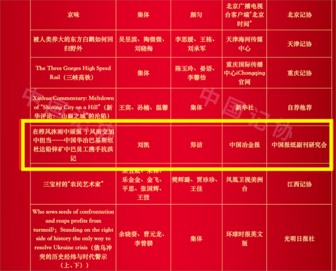 第33屆中國新聞獎評選結果近日揭曉,中國五礦所屬中國華冶作品《在櫛風沐雨中頑強 于風雨交加中擔當——中國華冶巴基斯坦杜達鉛鋅礦中巴員工攜手抗洪記》榮獲國際傳播類三等獎,這是中國五礦首次獲此殊榮,也是這項國家新聞作品最高獎對中國五礦踐行央企國際傳播使命,積極探索講好中國故事、傳播好中國聲音的激勵和褒獎。
