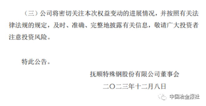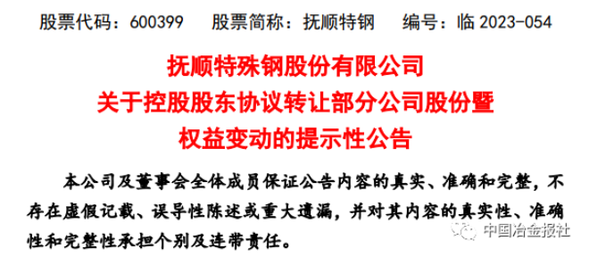 12月8日,撫順特鋼發布了《撫順特鋼:撫順特殊鋼股份有限公司簡式權益變動報告書(江蘇沙鋼集團有限公司)》公告(以下簡稱《公告》)。