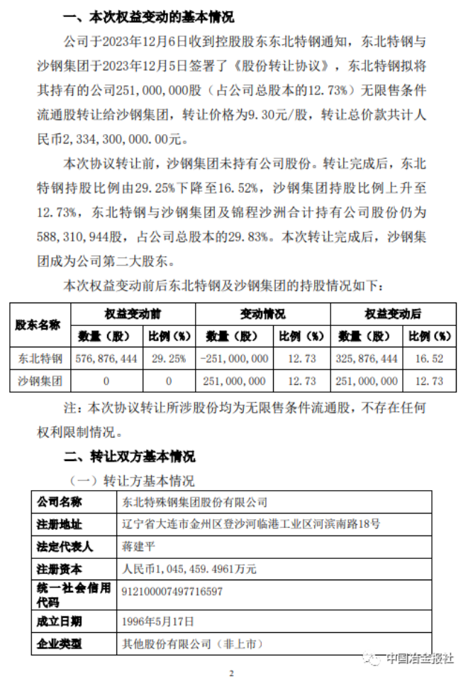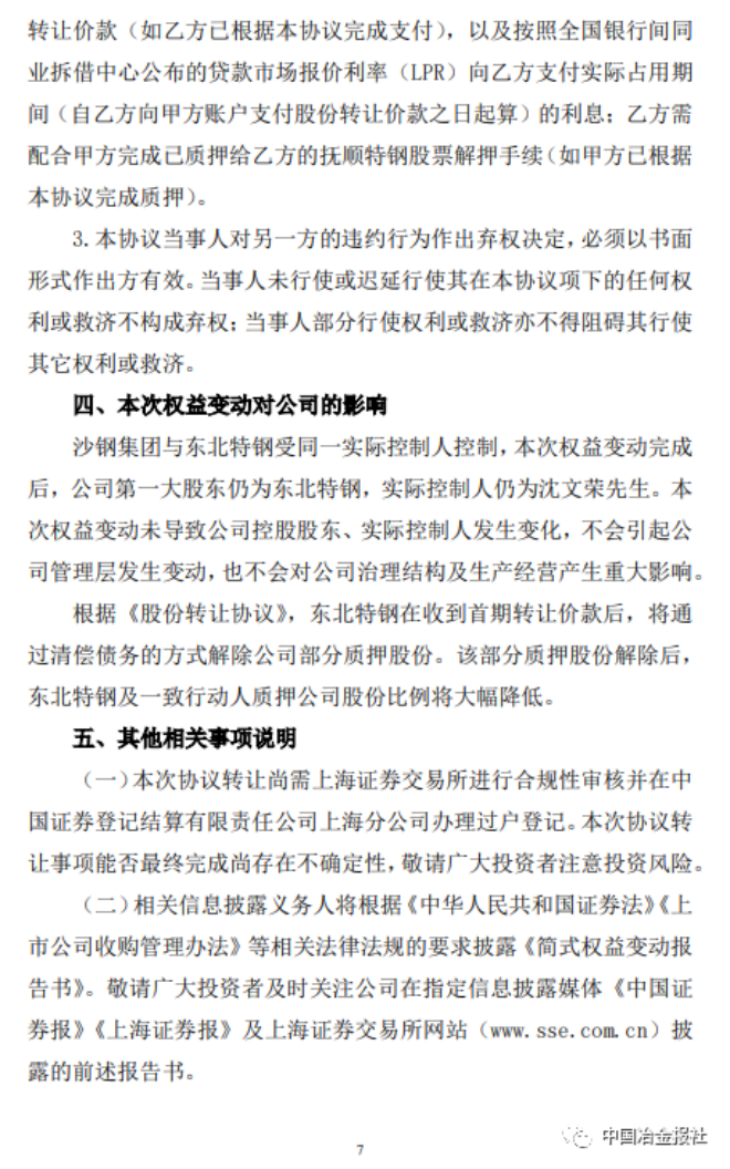 沙鋼集團與東北特鋼受同一實際控制人控制,本次權益變動完成后,公司第一大股東仍為東北特鋼,實際控制人仍為沈文榮先生。
