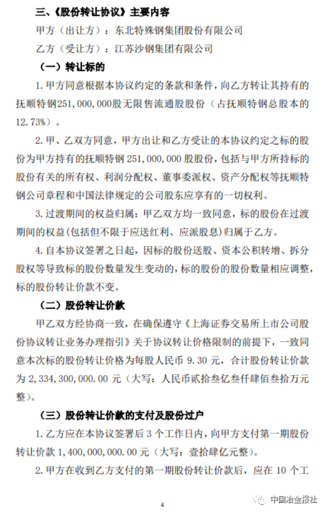 從《公告》中獲悉,公司控股股東東北特殊鋼集團股份有限公司(下稱“東北特鋼”)擬將其持有的公司2.51億股(占公司總股本的12.73%)無限售條件流通股,轉讓給江蘇沙鋼集團有限公司(下稱“沙鋼集團”),轉讓價格為9.3元/股,轉讓總價款23.34億元。