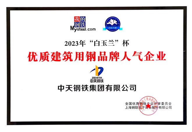 此外,在12月16日舉行的“中國大宗商品頒獎慶典”上,中天鋼鐵還獲評2023“白玉蘭”杯優質建筑用鋼品牌人氣企業獎、全國優特鋼生產企業優質品牌。