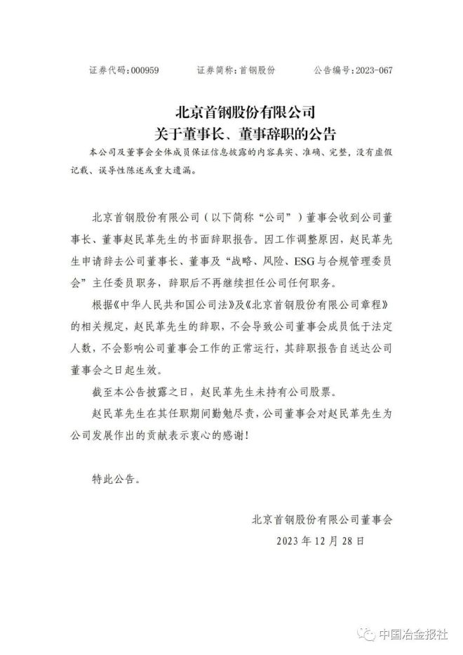 2023年12月28日晚,首鋼股份(000959.SZ)發(fā)布公告稱,因工作調(diào)整原因,趙民革申請(qǐng)辭去公司董事長(zhǎng)、董事及“戰(zhàn)略、風(fēng)險(xiǎn)、ESG與合規(guī)管理委員會(huì)”主任委員職務(wù),辭職后不再擔(dān)任公司任何職務(wù)。根據(jù)首鋼股份董事會(huì)決議,邱銀富接替趙民革成為首鋼股份新一任董事長(zhǎng)。