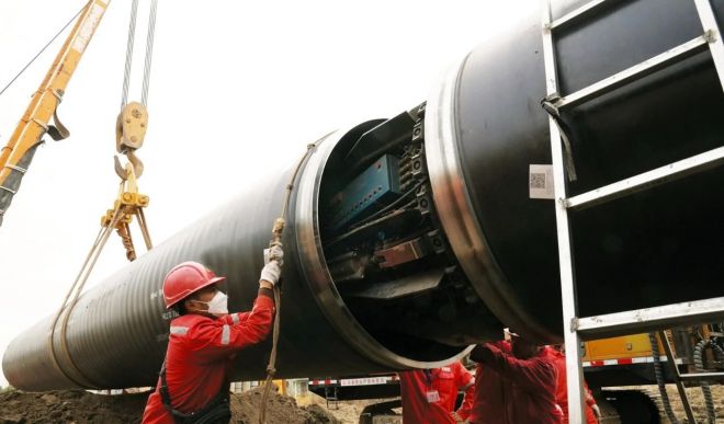 國(guó)家管網(wǎng)集團(tuán)施工人員正在安裝由鞍鋼管線鋼制作的管道。