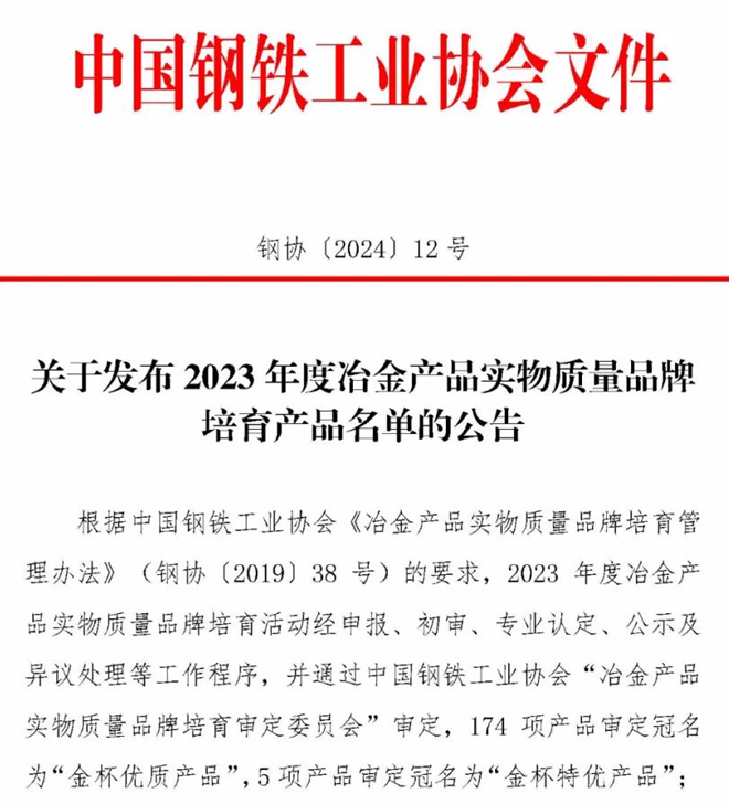 日前,中國鋼鐵工業協會發布了《2023年度冶金產品實物質量品牌培育產品名單》,建龍集團旗下共6家鋼鐵子公司11個產品獲評“金杯優質產品”。