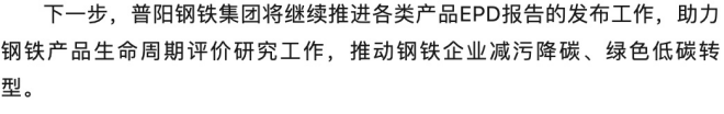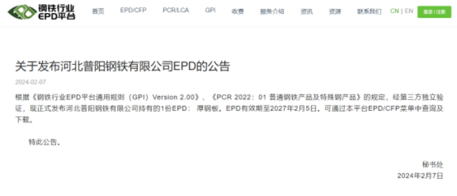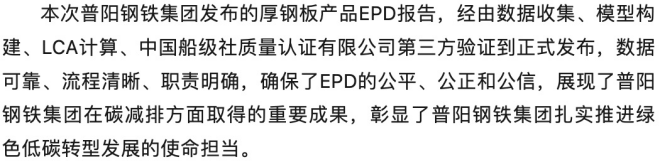 2024年2月7日,普陽鋼鐵集團厚鋼板產品EPD報告在中國鋼鐵工業(yè)協(xié)會鋼鐵EPD平臺正式發(fā)布,成為河北省內首家厚鋼板產品EPD發(fā)布企業(yè)。