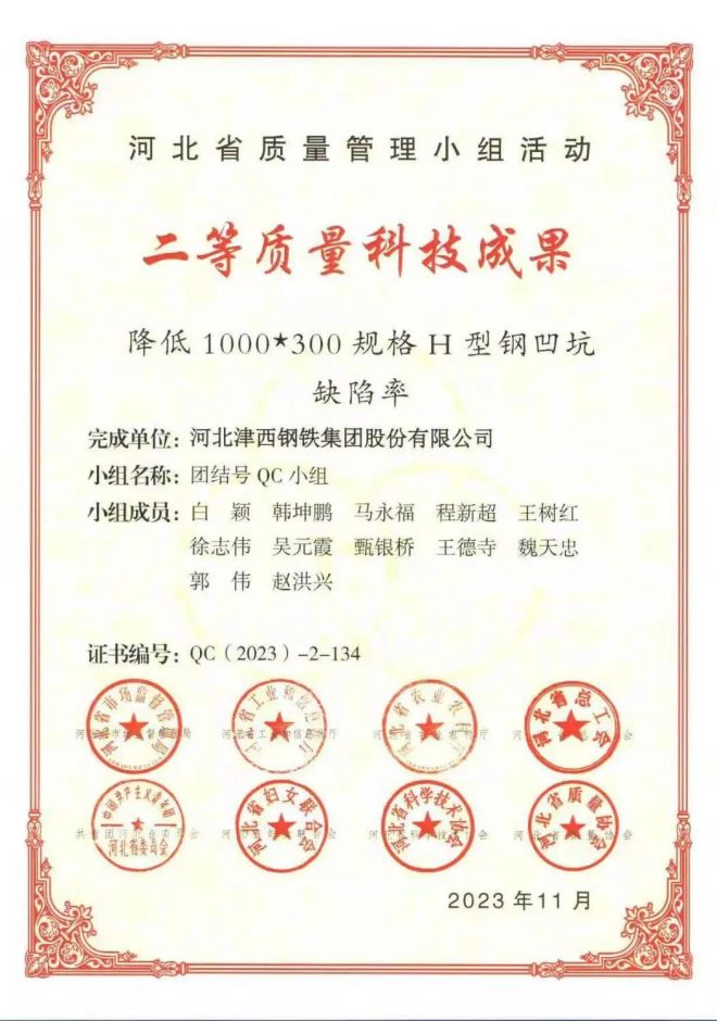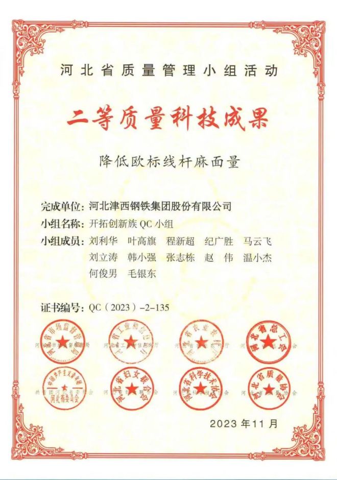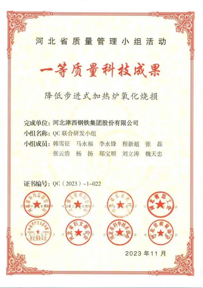 此前,河北省質量協會通報的2023年度質量管理小組活動質量科技成果名單中,津西《降低步進式加熱爐氧化燒損》獲一等質量成果;《降低歐標線桿麻面量》、《降低1000*300規格H型鋼凹坑缺陷率》兩項獲二等質量成果。