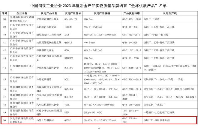 此次,津西申報的熱軋U型鋼板樁產品,通過申報、初審、專業認定、公示等程序,并通過中國鋼鐵工業協會“冶金產品實物質量培育審定委員會”審定,在全國申報企業中脫穎而出,得到專家評審組一致好評。