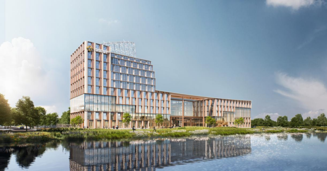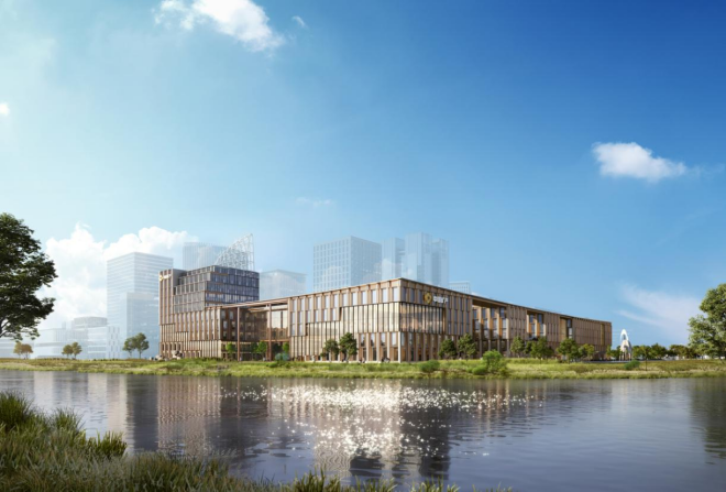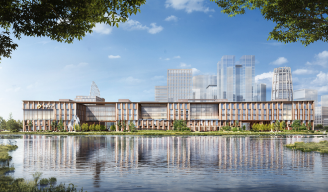 中國礦產資源集團有限公司雄安總部項目位于河北雄安新區啟動區中谷甲1號。項目利用地塊相鄰優勢形成水平線條的延展性,天際線微微上揚,配合建筑頂部帆型風電裝置,呈“揚帆啟航”之勢,并借助周邊臨水、近綠的景觀優勢,形成和諧、生態的景觀效果。