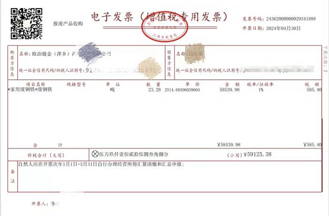 4月29日《公告》正式實施后,歐冶鏈金認真落實國家推動大規(guī)模設(shè)備更新和消費品以舊換新戰(zhàn)略和國稅總局的具體要求,號召各子公司積極申報開具“反向開票”,打通開票流程。4月30日上午,歐冶鏈金萍鄉(xiāng)公司在萍鄉(xiāng)市經(jīng)開區(qū)稅務(wù)局的支持和指導(dǎo)下,成功向自然人報廢產(chǎn)品出售者開出了歐冶鏈金首張“反向發(fā)票”。隨后,當天下午,鏈金物寶也開出了本單位首張“反向發(fā)票”。