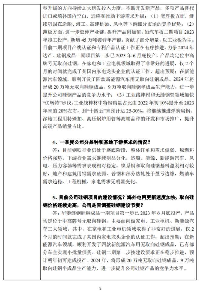 答:近年來,公司堅持差異化戰略,瞄準我國工業用鋼領域需求轉型升級的方向持續加大研發投入力度,不斷開發新產品,多項產品替代進口或填補國內空白,適應和推動下游需求升級:(1)寬厚板方面,繼續鞏固在造船、海工、高建橋梁、風電等下游細分市場的競爭優勢;(2)薄板方面,進一步延伸產業鏈,提升產品附加值,如汽車板二期項目2023年竣工投產,新增45萬噸鍍鋅年產能,貢獻了部分增量,以工業板為主。目前二期項目產線認證和專利產品認證工作正在有序推進,力爭2024年達產。硅鋼成品一期項目第一步已2023年6月底投產,產品均定位中高牌號無取向硅鋼,在家電和工業電機領域取得了非常好的進展,僅2個月的時間就完成了某國內家電龍頭企業的認證工作,超出預期;在新能源汽車領域,順利開發了四款新能源汽車用無取向硅鋼成品。2024年將形成 20萬噸無取向硅鋼成品、9萬噸取向硅鋼半成品生產能力,進一步提升公司硅鋼產品的競爭力水平;(3)工業線棒材和無縫鋼管領域加快“優轉特”步伐。工業線棒材中特鋼銷量占比由2022年初10%提升至2023年末的 20%左右,到“十四五”末預計達25-30%。將繼續推進彈簧扁鋼、深地工程用特殊扣、高壓鍋爐用管等高端品種的開發和市場推廣,提升高端產品銷量占比。