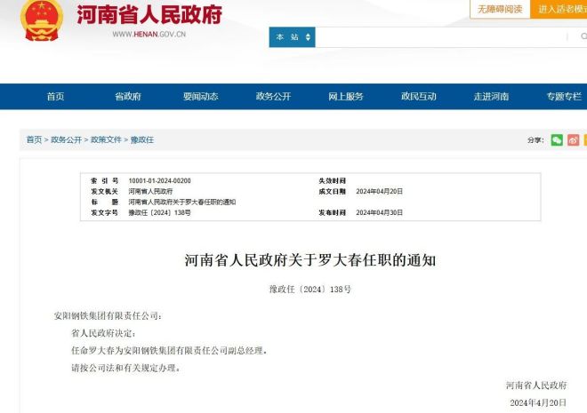 河南省人民政府網(wǎng)站顯示,河南省人民政府決定:任命羅大春為安陽(yáng)鋼鐵集團(tuán)有限責(zé)任公司副總經(jīng)理。