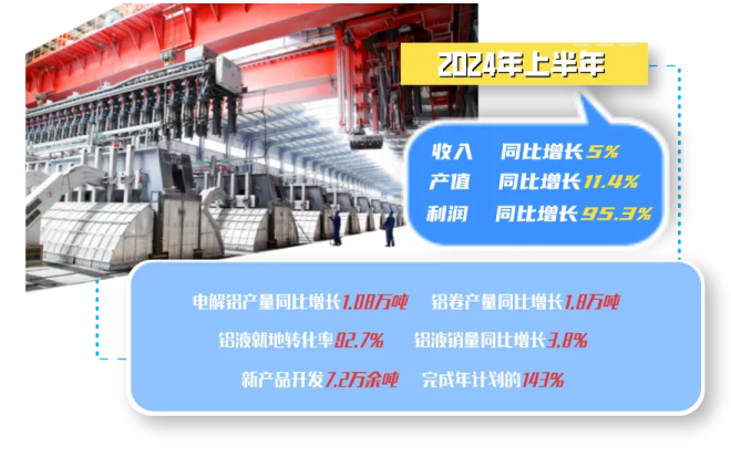 上半年,東興鋁業(yè)公司電解鋁、鋁卷產(chǎn)量分別同比增長1.08萬噸、1.8萬噸,收入同比增長5%,工業(yè)總產(chǎn)值同比增長11.4%,利潤同比增長95.3%。