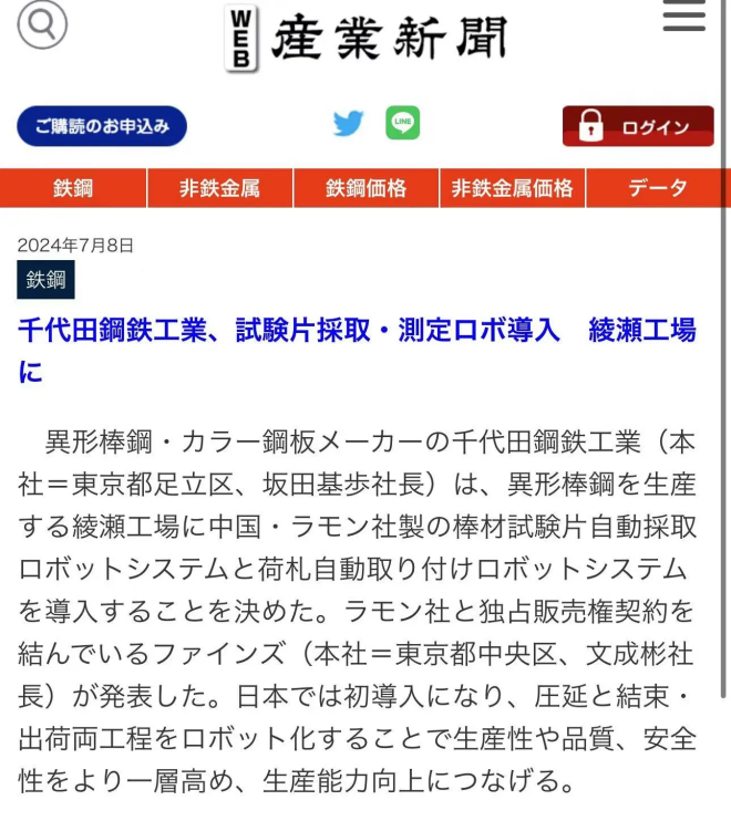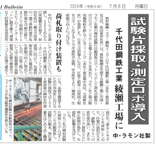 2024年7月8日,據日本《鋼鐵新聞》和《產業新聞》等權威媒體報道:為積極推動智能化新技術、新裝備,提高自動化水平,節省人力,提高安全性和生產率,日本知名鋼企——千代田鋼鐵工業株式會社,在其螺紋鋼生產基地綾瀨工廠(東京都足立區)引入鐳目公司創新研發的機械手棒材取樣系統和機械手焊標系統。這是日本鋼企首次引入兩種中國企業研發的智能化創新系統。
