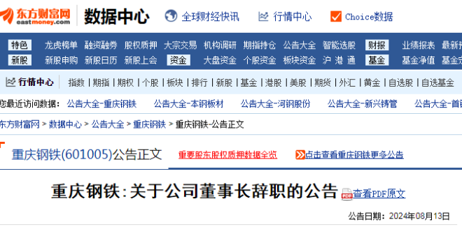 《重慶鋼鐵:關于公司董事長辭職的公告》