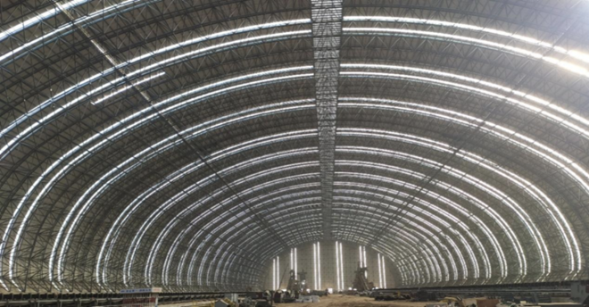 亮點一:多支線和直供系統(tǒng)的高效儲運新工藝與物流網(wǎng)協(xié)同,形成類型齊全、功能完備的綜合原料場。其中B型料場是目前國內(nèi)跨度最大的螺栓球網(wǎng)架結(jié)構(gòu)的全封閉料場。