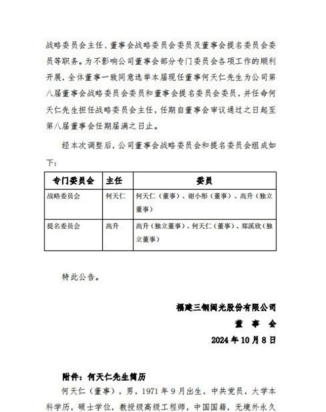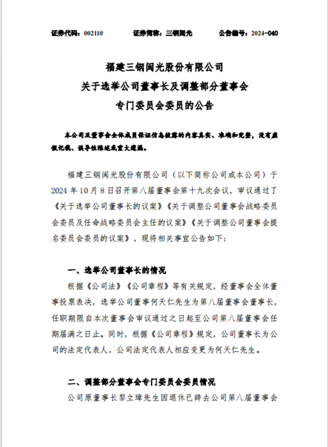 10月9日,福建三鋼閩光股份有限公司發(fā)布公告稱,于 2024 年 10 月 8 日召開第八屆董事會第十九次會議,審議通過了 《關(guān)于選舉公司董事長的議案》《關(guān)于調(diào)整公司董事會戰(zhàn)略委員會委員及任命戰(zhàn)略委員會主任的議案》《關(guān)于調(diào)整公司董事會提名委員會委員的議案》。