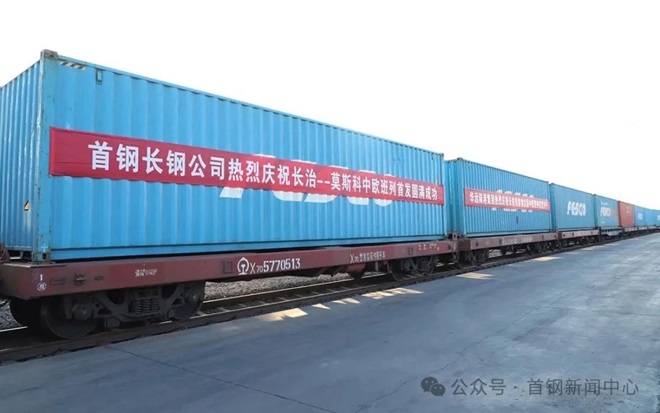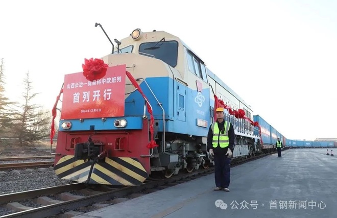 12月6日,中歐班列(長(zhǎng)治—莫斯科)在首鋼長(zhǎng)鋼公司長(zhǎng)鐵綠能物流園首發(fā)。