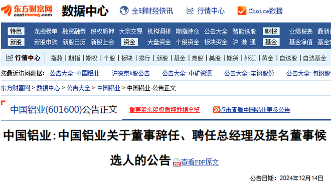 12月14日,中國(guó)鋁業(yè)發(fā)布了關(guān)于董事辭任、聘任總經(jīng)理及提名董事候選人的公告(以下簡(jiǎn)稱“公告”)。