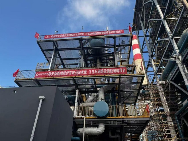 2024年12月16日,思安新能源股份有限公司(以下簡稱思安新能源)承建的江蘇永鋼集團有限公司5.2MW熔鹽儲能調峰項目成功并汽,這一里程碑事件標志著繼行業首套山西建龍鋼鐵有限公司煤氣熔鹽儲熱調峰項目后,思安新能源又一座熔鹽儲能項目順利投產。