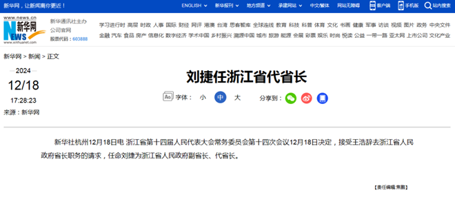 12月18日,據新華網消息顯示,浙江省第十四屆人民代表大會常務委員會第十四次會議決定,接受王浩辭去浙江省人民政府省長職務的請求,任命劉捷為浙江省人民政府副省長、代省長。