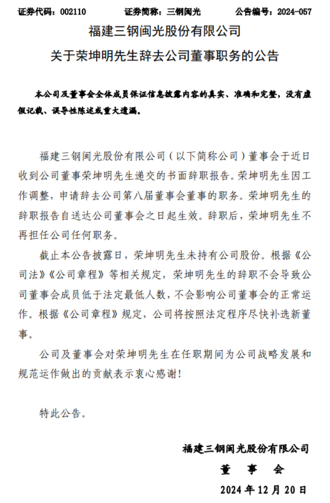 12月20日,福建三鋼閩光股份有限公司發(fā)布了《關(guān)于榮坤明先生辭去公司董事職務(wù)的公告》(以下簡(jiǎn)稱《公告》)。