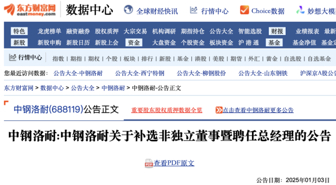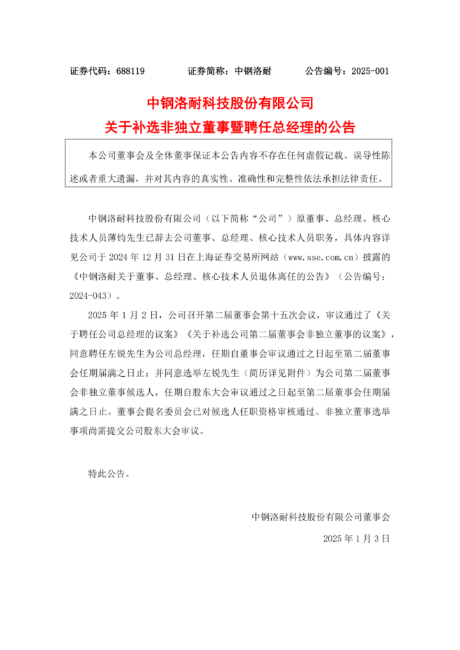 1月3日,中鋼洛耐發布《關于補選非獨立董事暨聘任總經理的公告》(以下簡稱《公告一》。