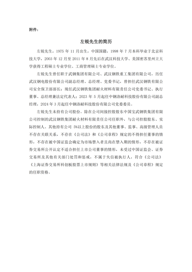 左銳先生曾任職于武鋼集團有限公司、武漢鋼鐵重工集團有限公司,歷任武漢鋼電股份有限公司副總經理、總經理、黨委書記,曾擔任武漢鋼鐵有限公司安全保衛部部長;現任武漢鋼鐵集團耐火材料有限責任公司黨委書記、執行董事、總經理兼法定代表人;2023年5月起任中鋼洛耐科技股份有限公司副總經理,2024年3月起任中鋼洛耐科技股份有限公司黨委委員。