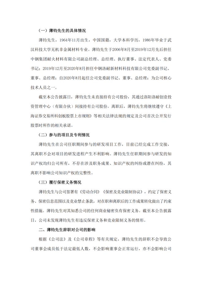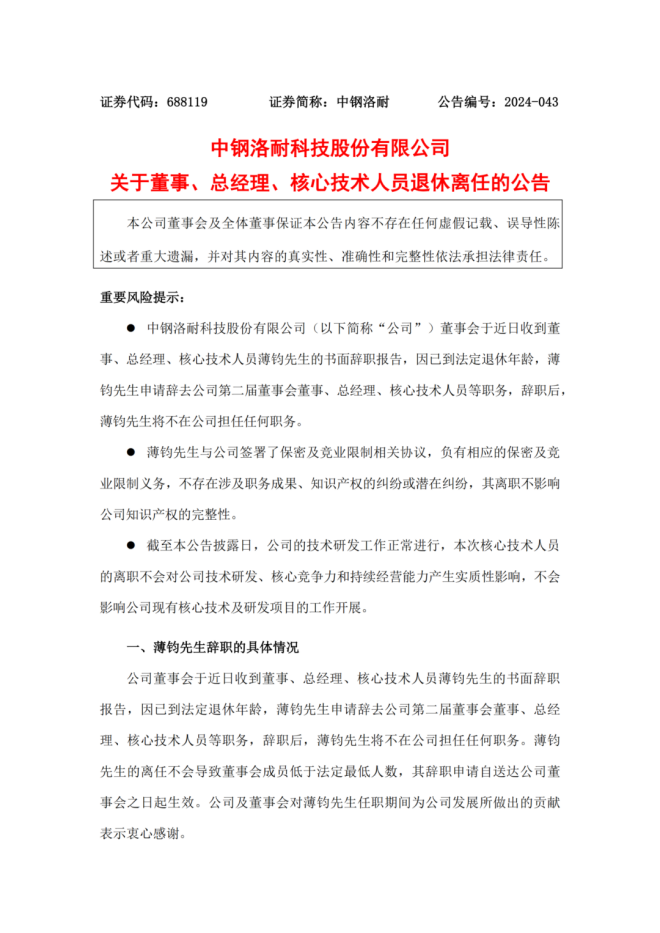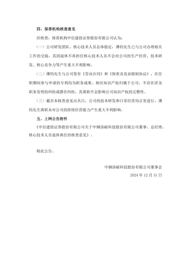 2024年12月31日,中鋼洛耐發布《關于董事、總經理、核心技術人員退休離任的公告》(以下簡稱《公告二》。