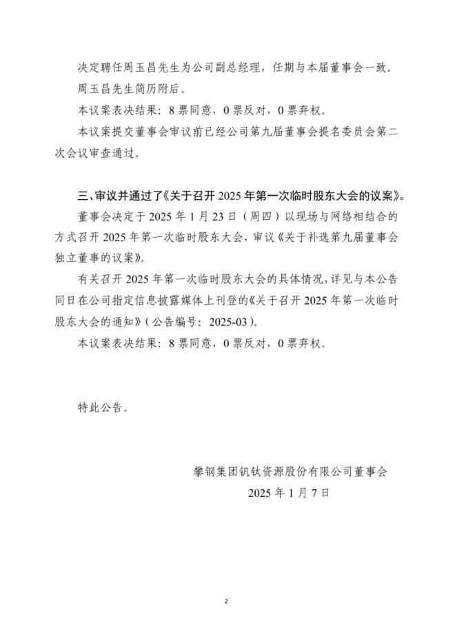 1月7日,攀鋼集團釩鈦資源股份有限公司(以下簡稱“釩鈦股份”)發布多篇公告。