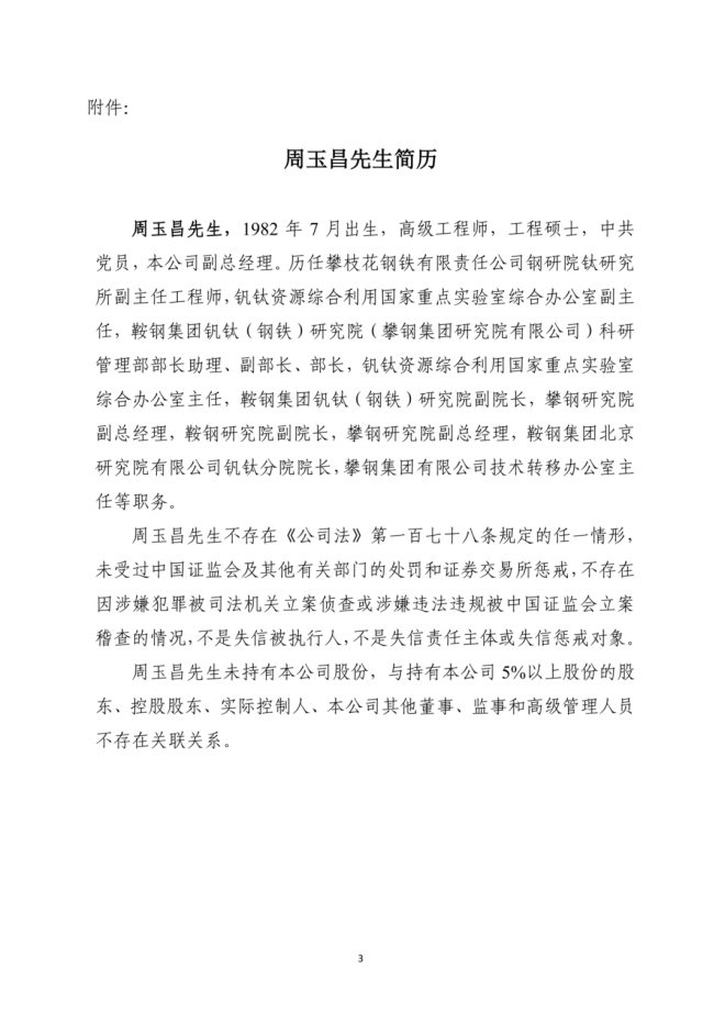 周玉昌先生,1982 年 7 月出生,高級工程師,工程碩士,中共黨員,本公司副總經理。歷任攀枝花鋼鐵有限責任公司鋼研院鈦研究所副主任工程師,釩鈦資源綜合利用國家重點實驗室綜合辦公室副主任,鞍鋼集團釩鈦(鋼鐵)研究院(攀鋼集團研究院有限公司)科研管理部部長助理、副部長、部長,釩鈦資源綜合利用國家重點實驗室綜合辦公室主任,鞍鋼集團釩鈦(鋼鐵)研究院副院長,攀鋼研究院副總經理,鞍鋼研究院副院長,攀鋼研究院副總經理,鞍鋼集團北京研究院有限公司釩鈦分院院長,攀鋼集團有限公司技術轉移辦公室主任等職務。
