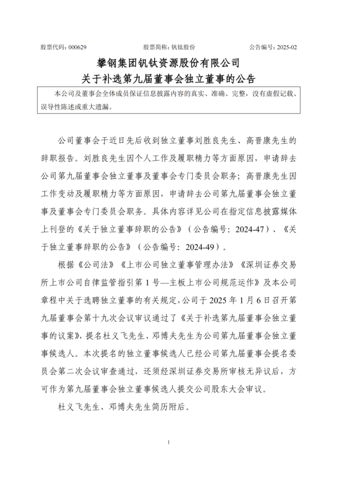 釩鈦股份發布《第九屆董事會第十九次會議決議公告》與《關于補選第九屆董事會獨立董事的公告》。